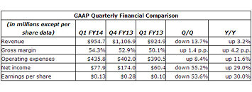 NVIDIA today reported revenue for the first quarter of fiscal 2014, ended April 28, 2013, of $954.7 million, down 13.7 percent from $1.11 billion in the fourth quarter of fiscal 2013. GAAP earnings per diluted share were $0.13, down 53.6 percent from $0.28 in the prior quarter. Non-GAAP earnings per diluted share were $0.18, down 48.6 percent from $0.35 in the prior quarter.