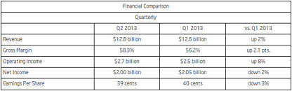 On a non-GAAP basis, second quarter net income was $299 million, or $1.21 per diluted share, compared to net income of $51 million, or $0.21 per diluted share, in the second quarter of fiscal 2012 and net income of $207 million, or $0.84 per diluted share, in the first quarter of fiscal 2013. For reconciliation of non-GAAP to GAAP results, see accompanying financial tables and footnotes.