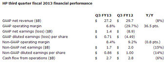 HP today announced financial results for its third fiscal quarter ended July 31, 2013. Third quarter GAAP diluted earnings per share (EPS) was $0.71, up from a GAAP diluted loss per share of $4.49 in the prior-year period and above its previously provided outlook of $0.56 to $0.59 per share. Third quarter non-GAAP diluted EPS was $0.86, down from $1.00 in the prior-year period and within its previously provided outlook of $0.84 to $0.87 per share. Third quarter non-GAAP earnings information excludes after-tax costs of $286 million, or $0.15 per diluted share, related to amortization of purchased intangible assets, restructuring charges and acquisition-related charges.