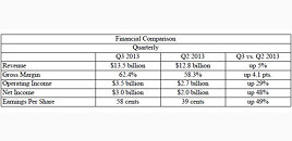 Third-quarter net income was $4.0 billion compared with $3.8 billion in the third-quarter of 2012, an increase of 6 percent. Operating (non-GAAP) net income was $4.4 billion, as compared with $4.2 billion in the third-quarter of 2012, an increase of 6 percent. Total revenues for the third-quarter of 2013 of $23.7 billion were down 4 percent (down 2 percent, adjusting for currency) from the third-quarter of 2012.