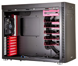 This community collaborated chassis sports a reverse airflow design in which cool air is pulled into the chassis from the rear filtered 120 mm fan. The front 140mm fan above the front-mounted PSU pulls hardware-damaging hot air out of the case. An additional 120 mm or 140 mm fan can be mounted on the floor of the chassis.