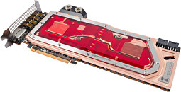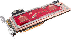The German-based liquid cooling specialist Aqua Computer has added the full cover water block kryographics Vesuvius for R9 295X2 cards to its portfolio. The block is entirely made in Germany and milled from 2.72kg high-purity electrolytic copper raw material. It covers the GPUs, all RAM chips, the voltage regulators and the PCIe bridge chip. All areas are covered by the flow path of the cooling liquid to provide an excellent cooling performance.