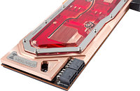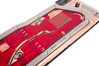 Both GPUs are covered by a micro structure with a 0.5 mm grid. The water flows through both structures in parallel which allows an even temperature for both GPUs. To achieve this effect the cooling structures use a different depth which makes sure that the same amount of water flows through both of them.