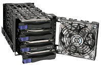 The Black Vortex MB074SP-1B is a hot-swappable 4 bay 3.5" SATA HDD cooler cage built robust from durable metal. It has many configurable options such as fan speed control, fan LED brightness control and power button for each of the drive bay. The hot swap function and EZ-Grip handles give you the ability to swap drives without breaking a sweat. The quiet 120mm cool blue LED fan combined with all metal ventilated design keep your drives cool, lowering your overall system temperature and thus increasing your hard drives' life span. The removable dust cover prevents dirt and dust from entering the case. The Black Vortex MB074SP-1B is a must-have HDD cooler cage for any PC builder seeking quality components with a ton of features and rugged good looks.