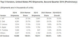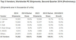 Worldwide PC shipments totaled 74.4 million units in the second quarter of 2014 (2Q14), a year-on-year decline of -1.7%, according to the International Data Corporation (IDC) Worldwide Quarterly PC Tracker. The results reflect the smallest decline in global PC shipments since the second quarter of 2012 when declining shipments of mini notebooks combined with a surge in tablet sales to disrupt the PC market.